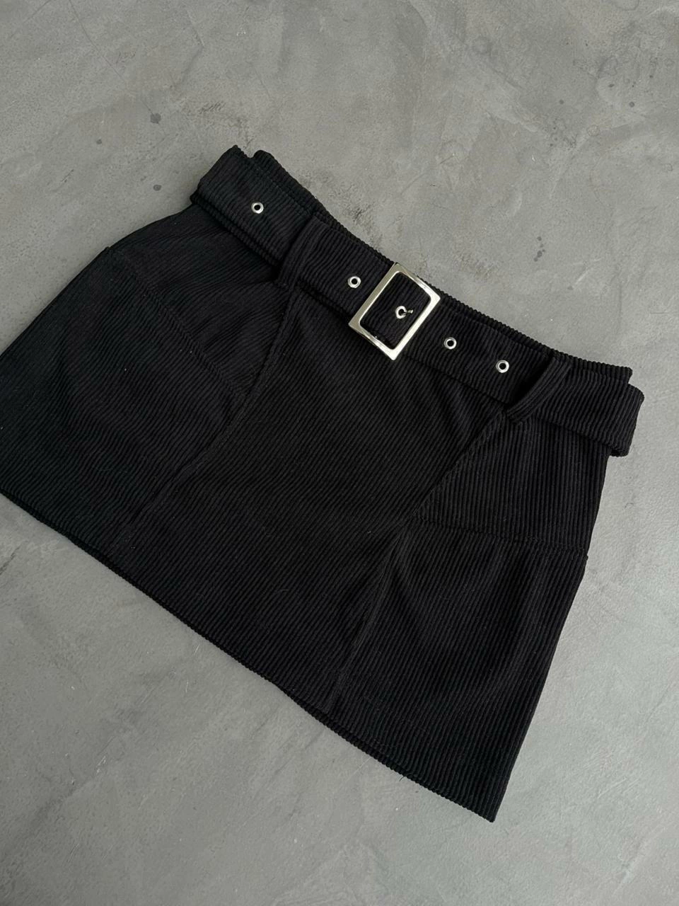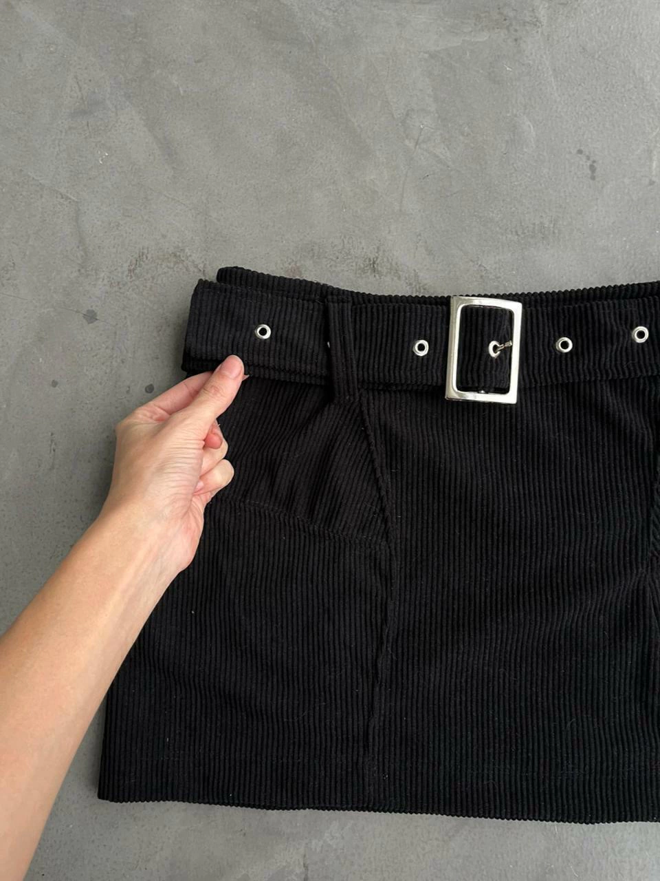 Mini de corderoy tiro bajo con cinto incluido. Tiene recortes adelante y atras generando un efecto levemente acampanado.
